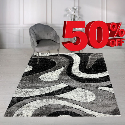 Covor Pufos cu Fir de Matase Si Bumbac 3D Tip Valuri,Gri/Negru