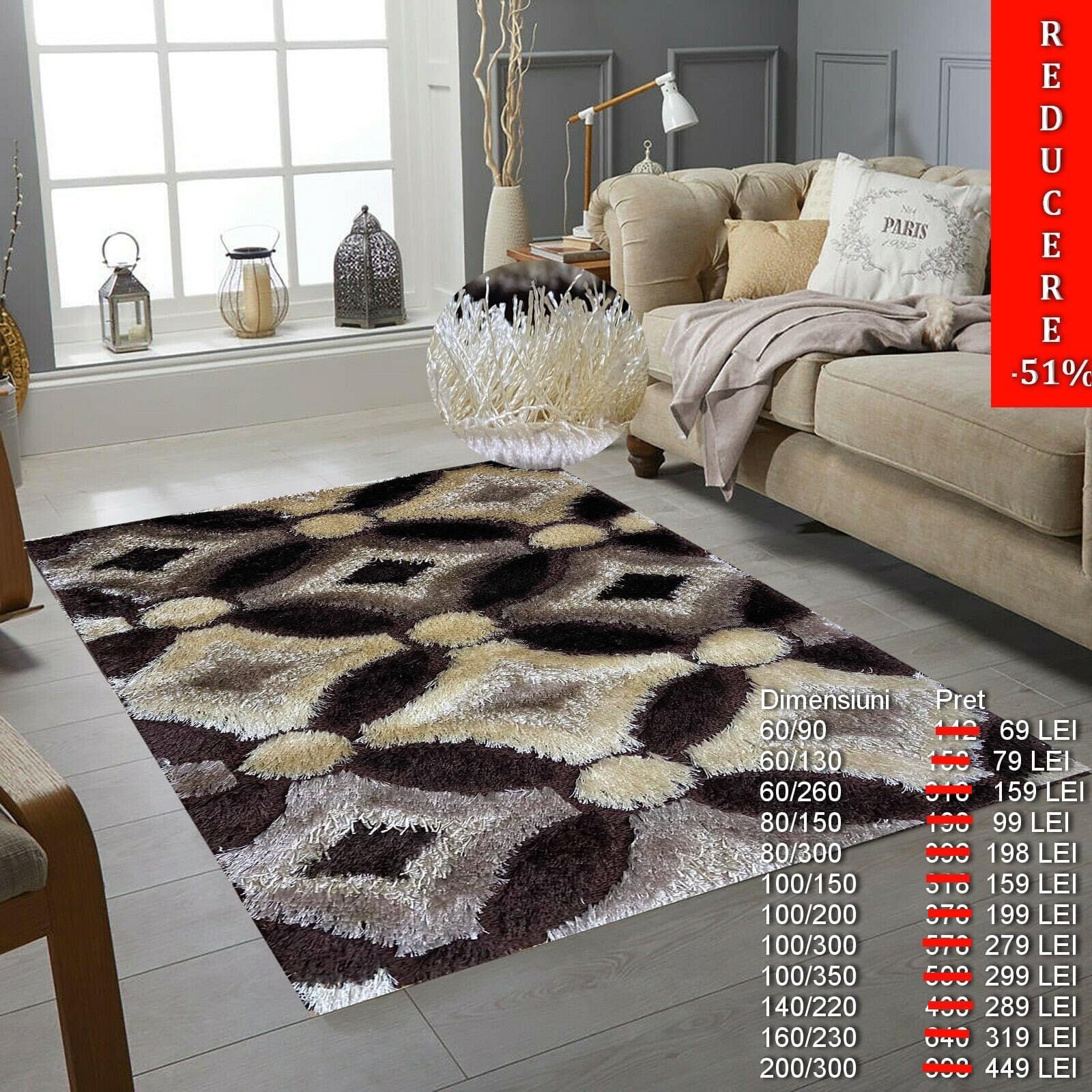 Covor Pufos cu fir lung de matase cu imprimeu geometric tip flori