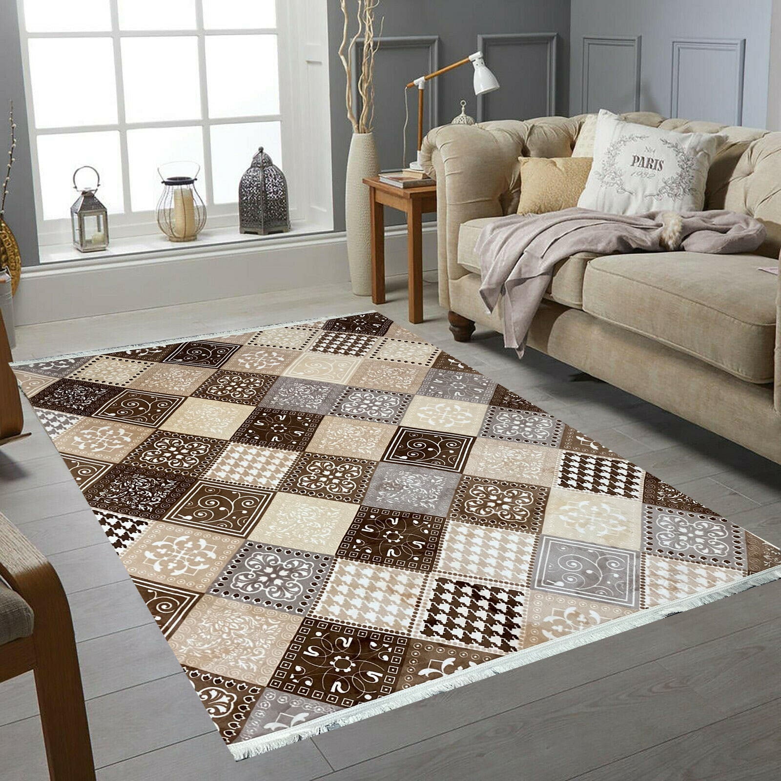 Covor Antiderapant cu Insertii Moderne Tip Romburi ,Bej/Maro