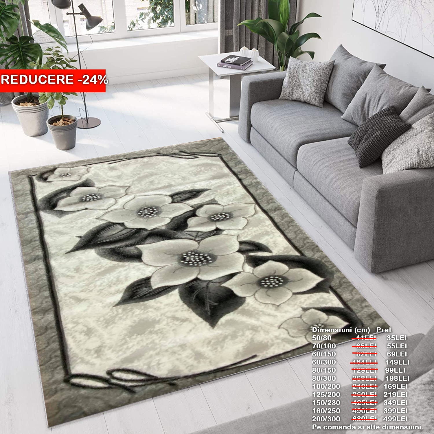 Covor cu Insertii Florale de TIp Bujor ,Gri