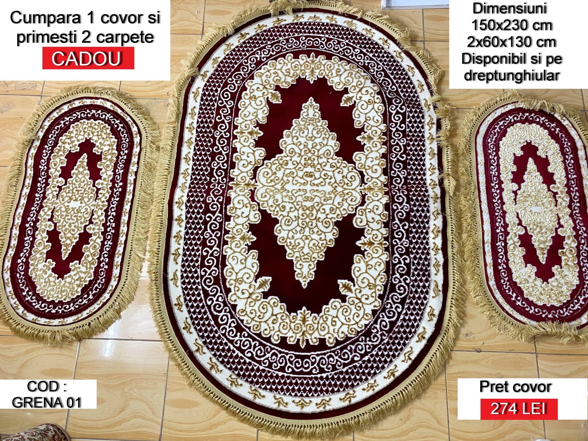 Dimensiunile covoarelor sunt 140/220 cm cel mare ,iar cele 2 carpete primite cadou au 60/130 cm .
