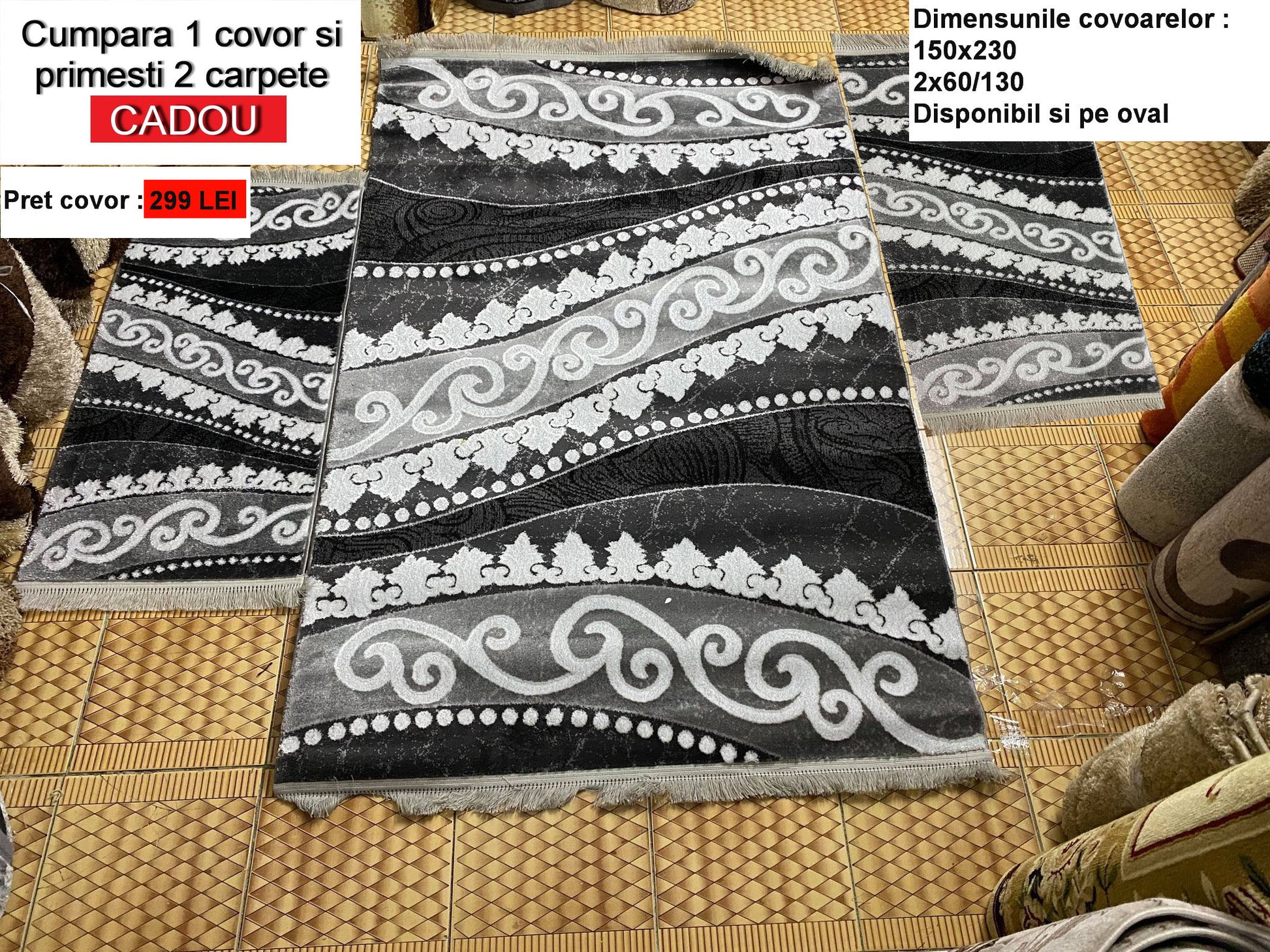 Dimensiunile covoarelor sunt 150/230 cm cel mare ,iar cele 2 carpete primite cadou au 60/130 cm .