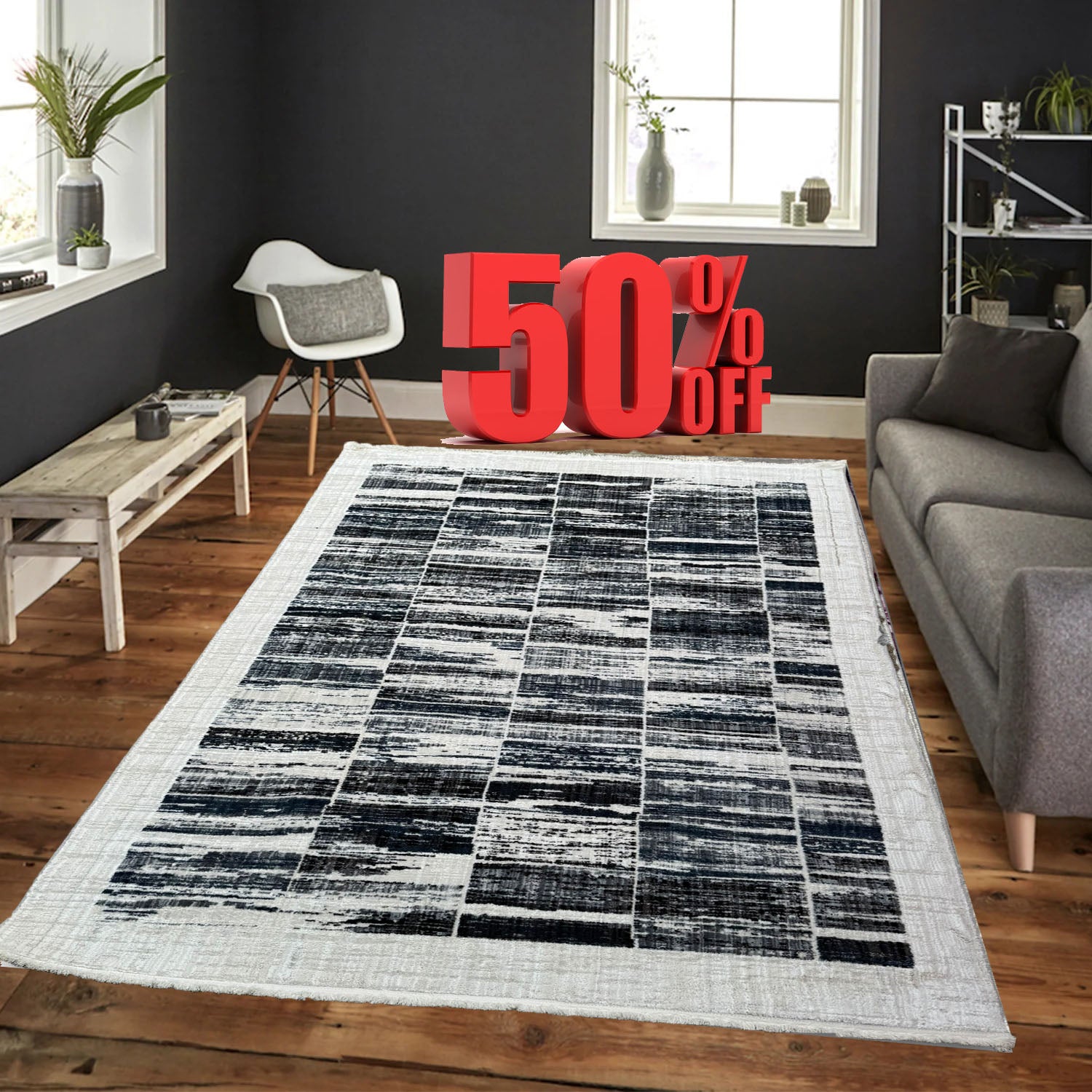 Covor cu Insertii Geometrice in Chenar si Franjuri ,Crem/Gri/Indigo