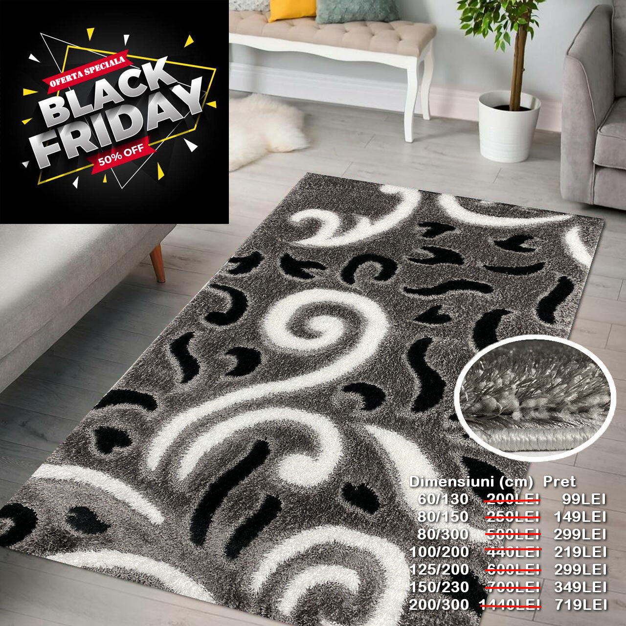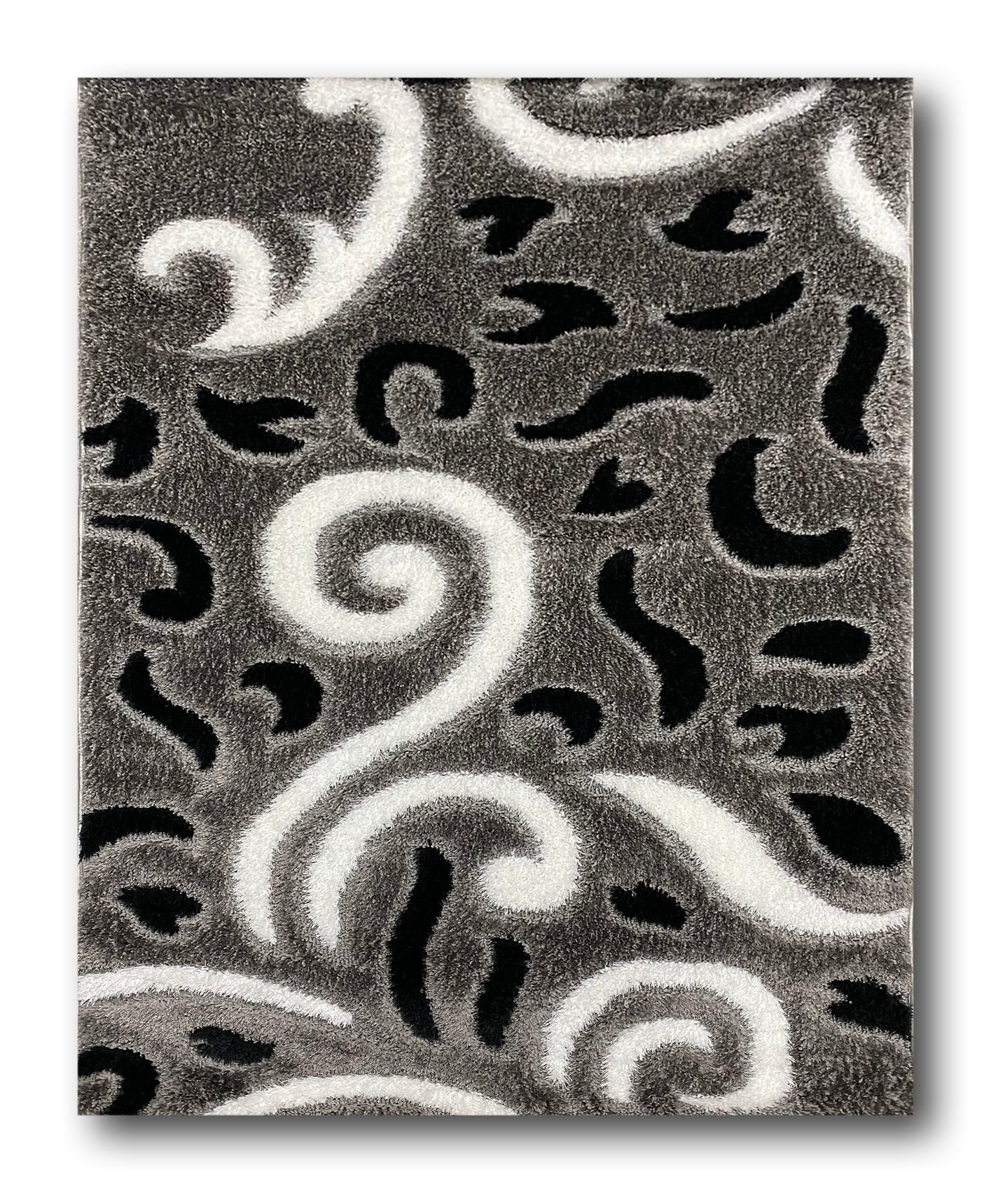 Covor Pufos cu Fir de Matase si Bumbac 3D tip Coarne,Gri/Alb/Negru