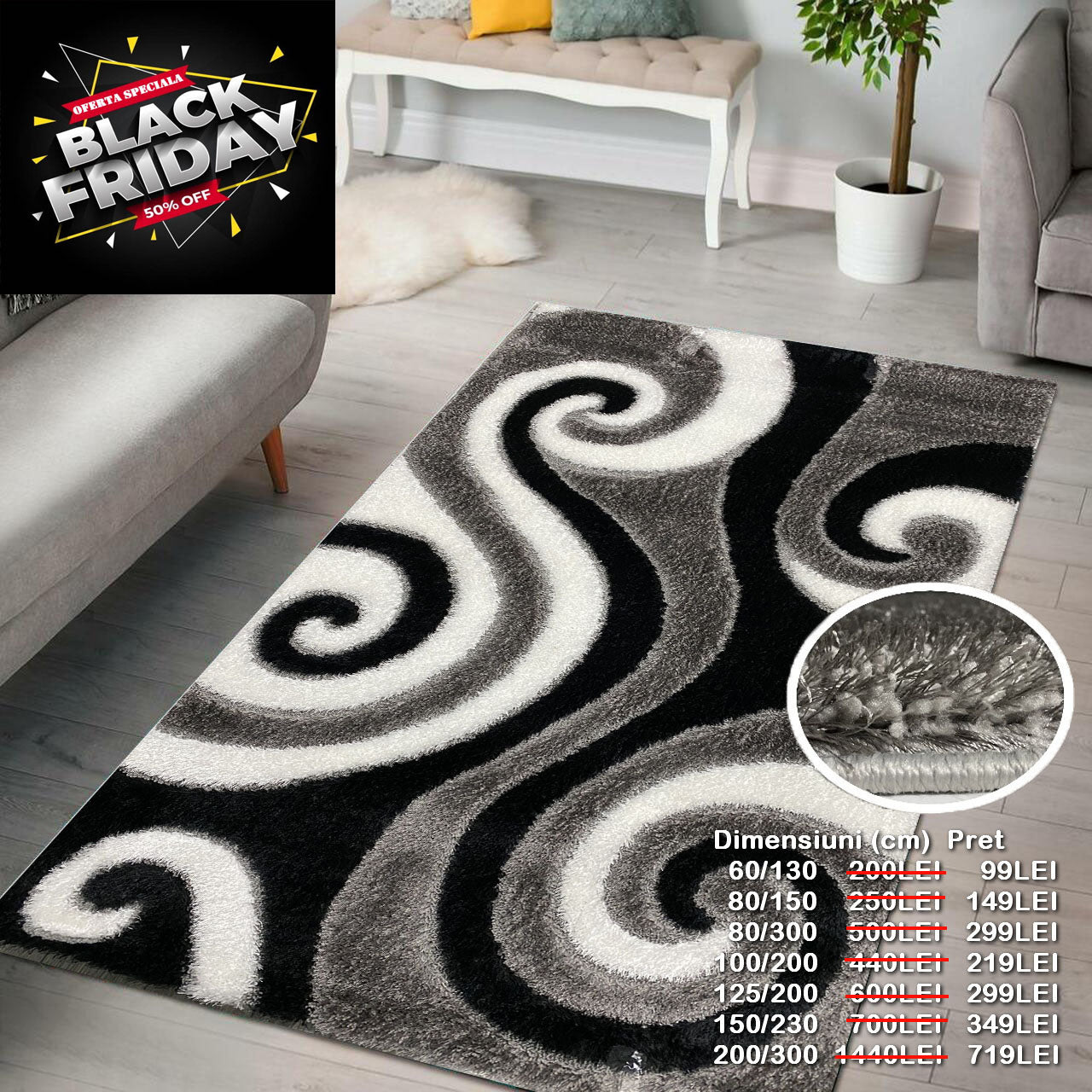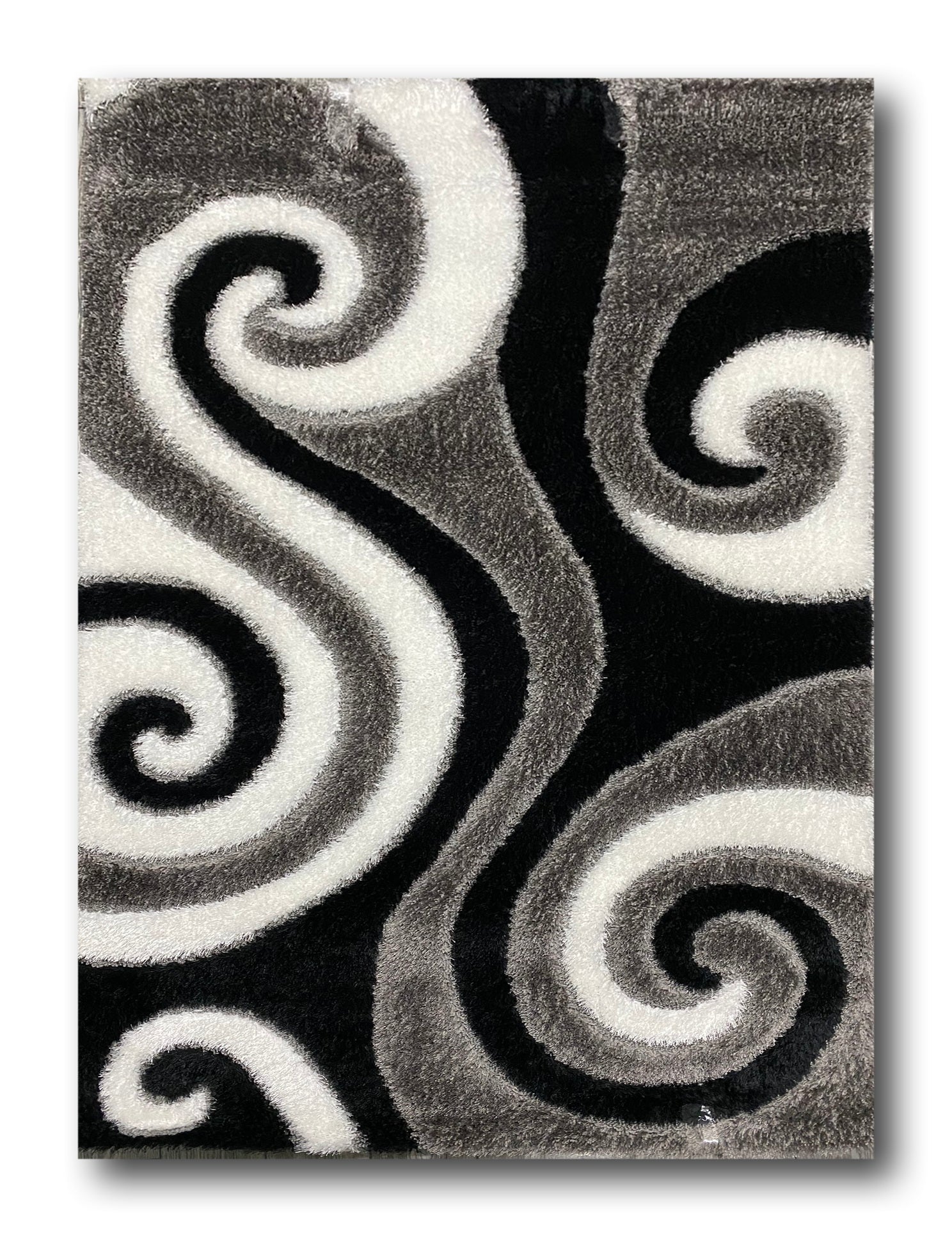 Covor Pufos cu Fir de Matase Si Bumbac 3D Tip Valuri,Gri/Negru