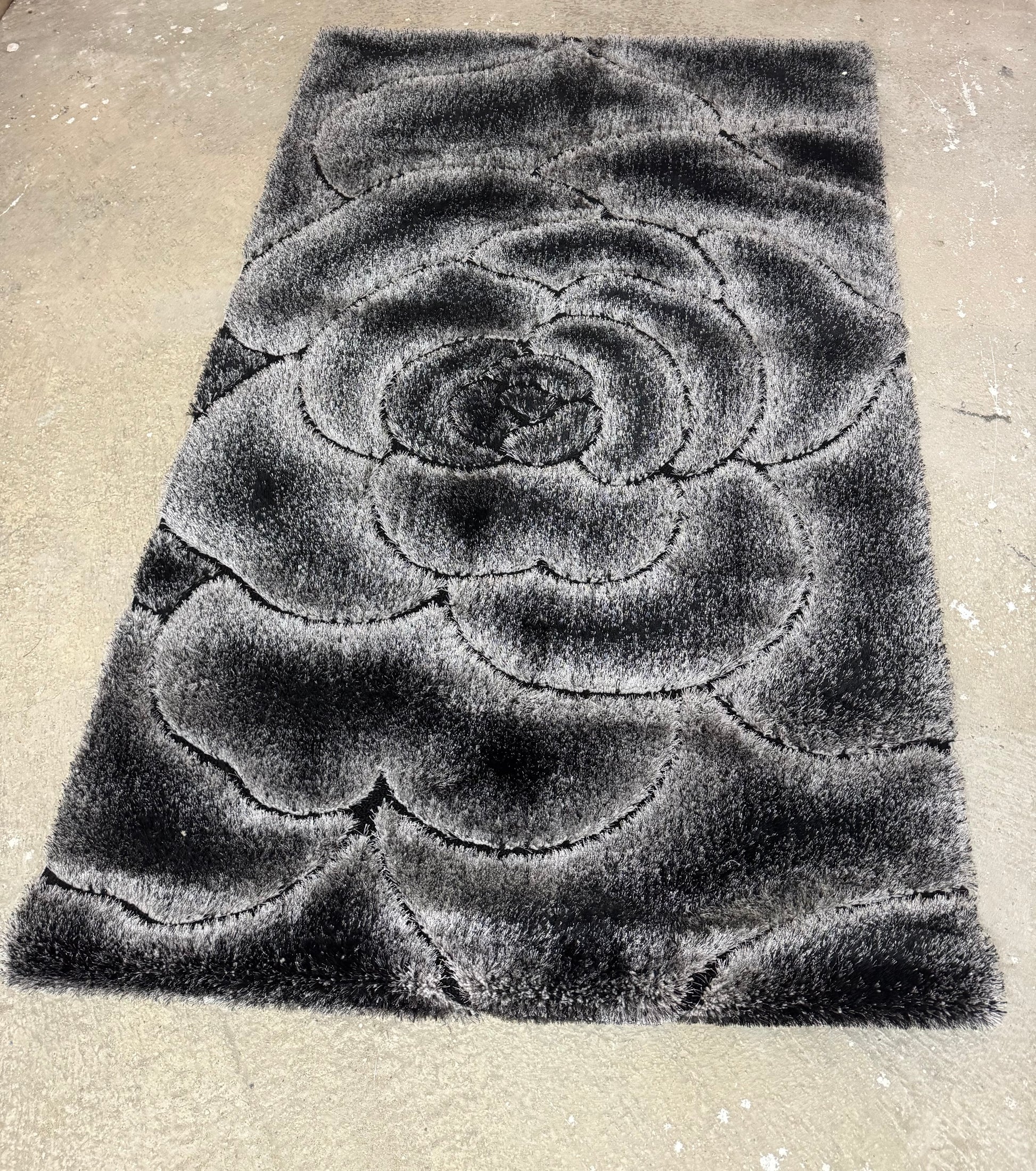 Covor Pufos cu Fir de Matase si Bumbac Trandafir 3D ,Gri/Negru