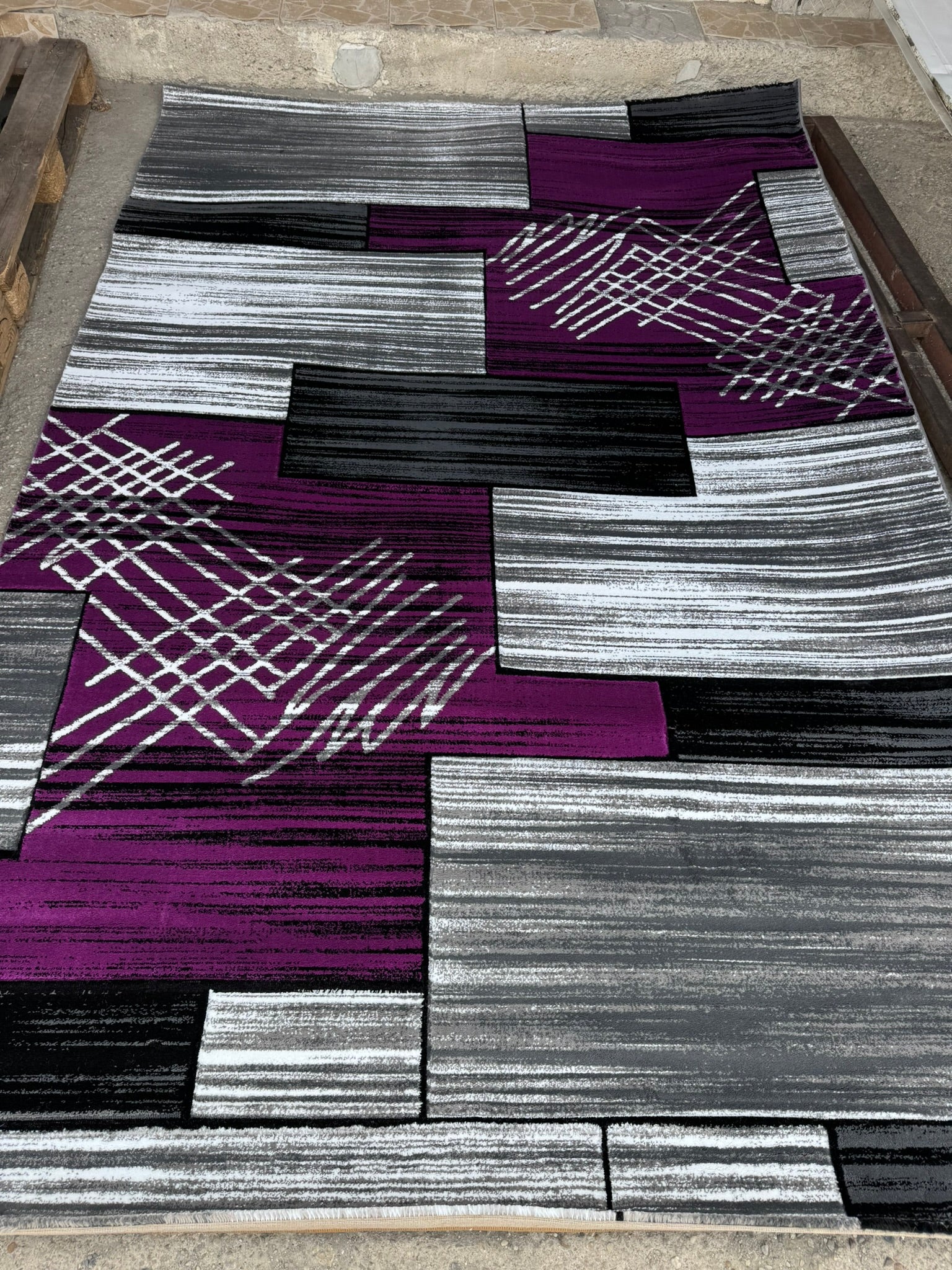 Covor Modern tip Patrate si Lini, Gri/Negru/Mov