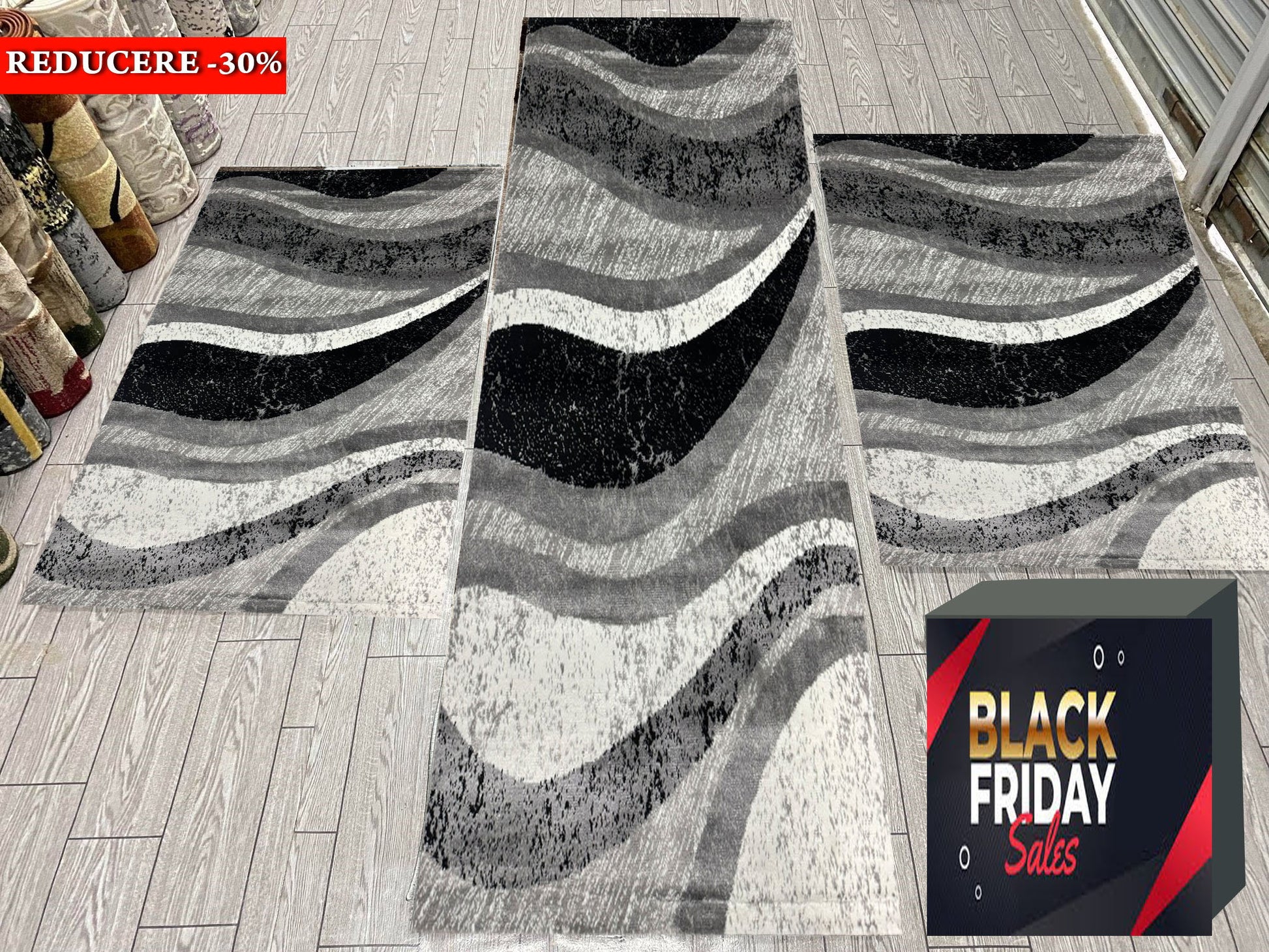 Set 3 Traverse cu Insertii Geometrice Tip Valuri,Gri/Negru/Alb
