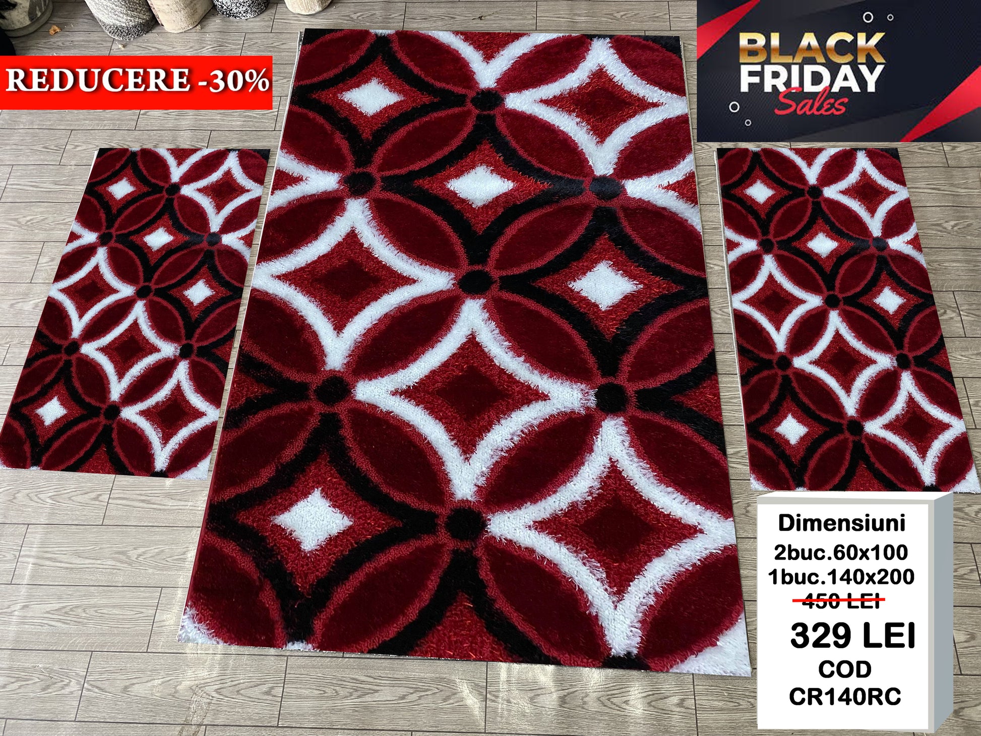 Set Covor si Traverse Pufoase de Matase 3D,Grena/Negru/Alb